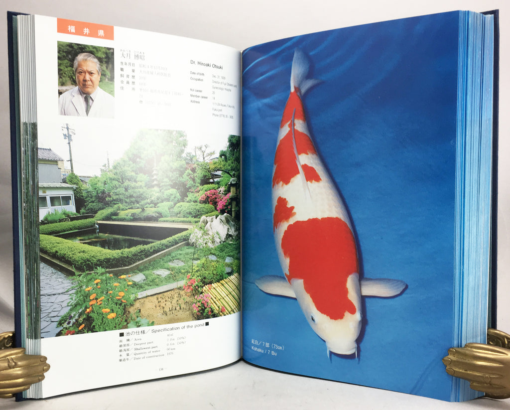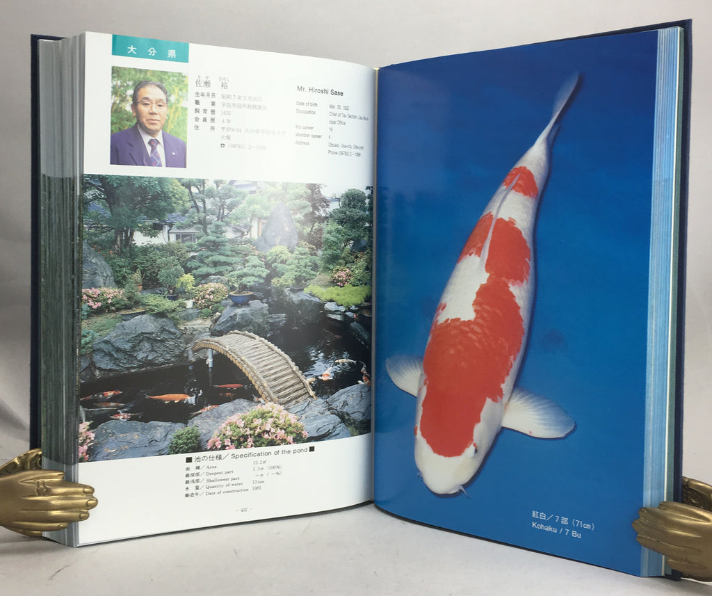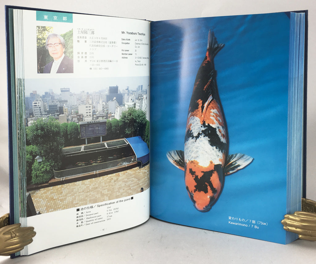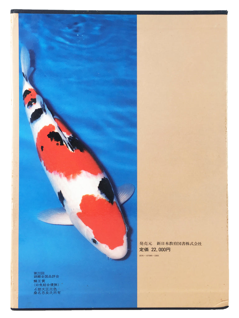 Pp. 589, (3); color frontispiece photo, 287 full page color photographs of individual prize-winning koi and 287 color photographs of the pond and their owner that produced each prize-winning koi. Publisher’s original black cloth, lettered in silver on the spine, in the original color pictorial laminated hard slipcase, 4to (12 x 8.5 inches). The preface reads: “Our koi are becoming more and more gorgeous and bigger. Let us put today’s koi and their ponds on record so this will be appreciated as a page of koi history. This book will serve as a reference of landscape gardeners, pond builders, those who handle relevant machinery and to koi food makers”. The entire work is printed high-quality glossy photographic paper which has produced truly beautiful color photography. The original selling price of this work listed on the rear side of the slipcase is 22,000 Yen. The text is simultaneously presented in Japanese and in English throughout the entire volume. No ownership marks and no signs of use. A Japanese version of the ‘ISBN’ is printed on the slipcase: 2076-107089-3383.