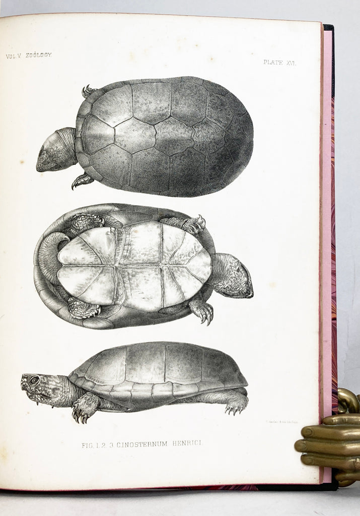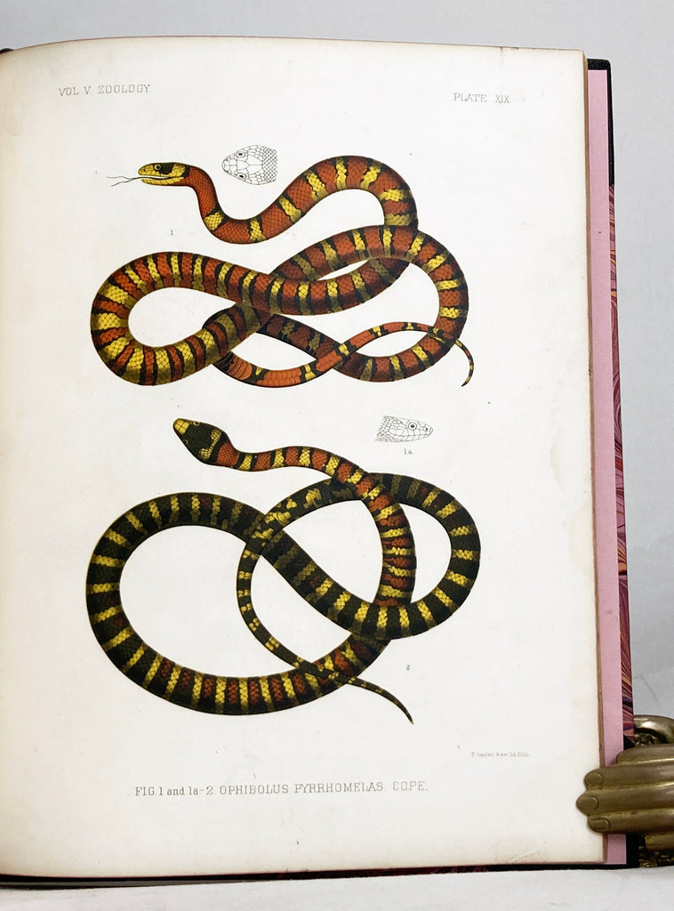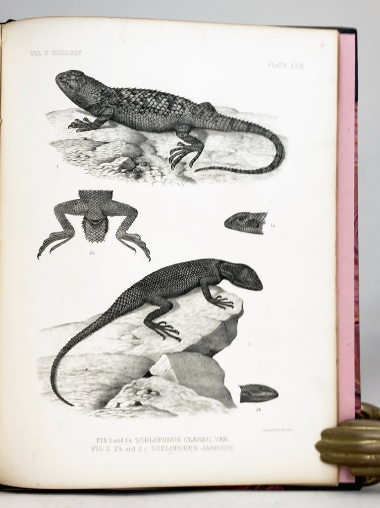 Pp. 509-633, 991-996, 3 full page chromolithographic plates, 7 uncolored lithographic plates. Recent one-half black goat-skin morocco leather, title leather label on spine, over pink marble boards, pink endpapers. From the Report upon the Geographical and Geological Explorations and Surveys west of the One Hundredth Meridian, Volume 5, chapter IV and chapter V. Plates numbered XVI-XXV.